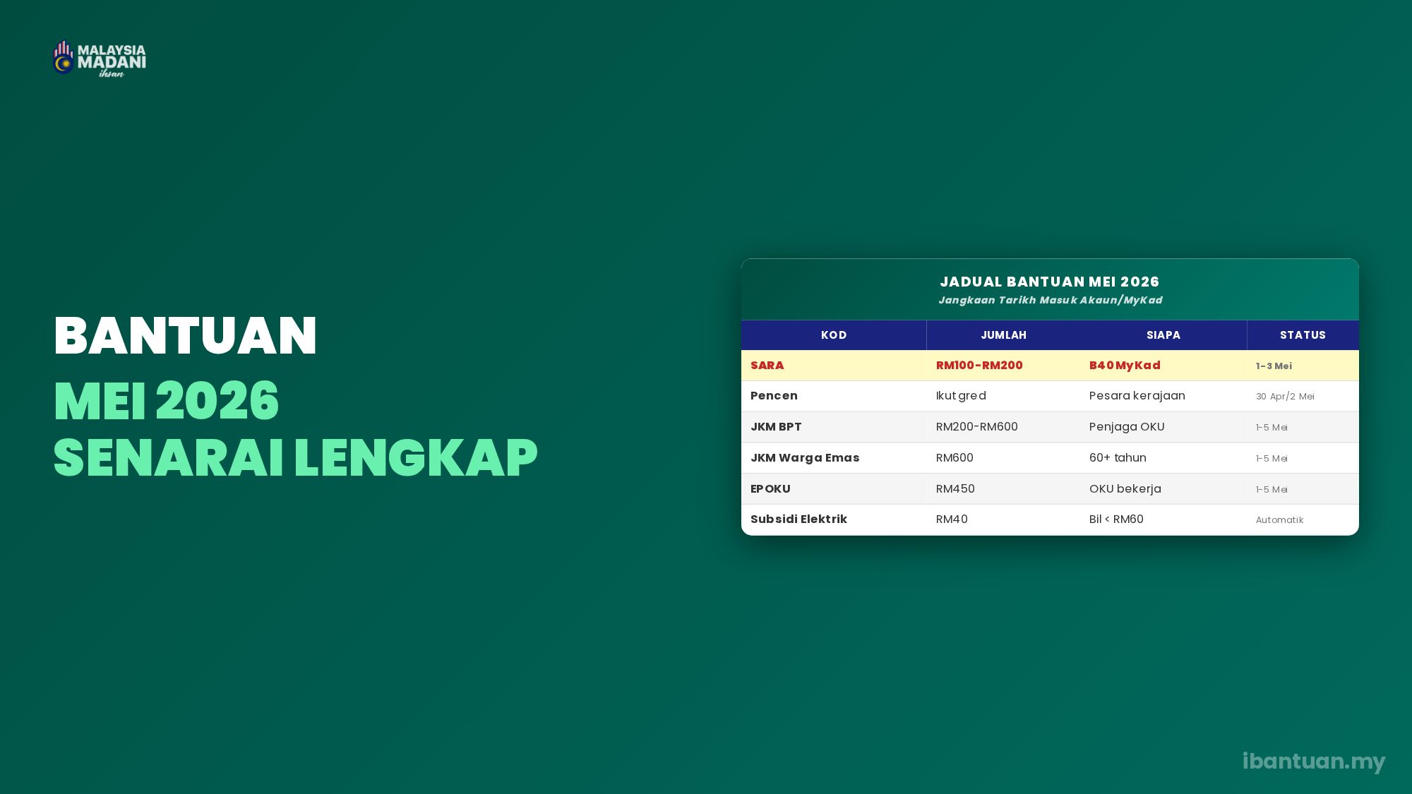 | Bantuan Warga Emas JKM | RM600 | 1 – 5 Mei | Warga emas 60+ layak |