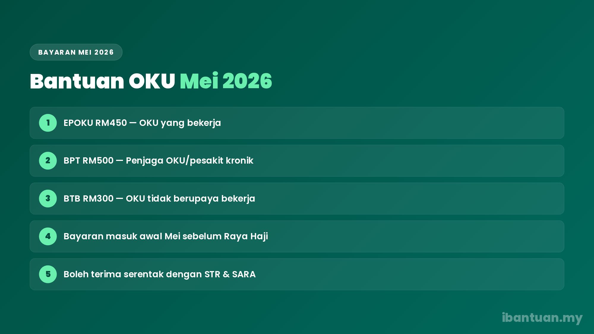 | BTB (Bantuan OKU Tidak Berupaya Bekerja) | RM300 | OKU umur 16-59 tak mampu bekerja | Akaun bank |