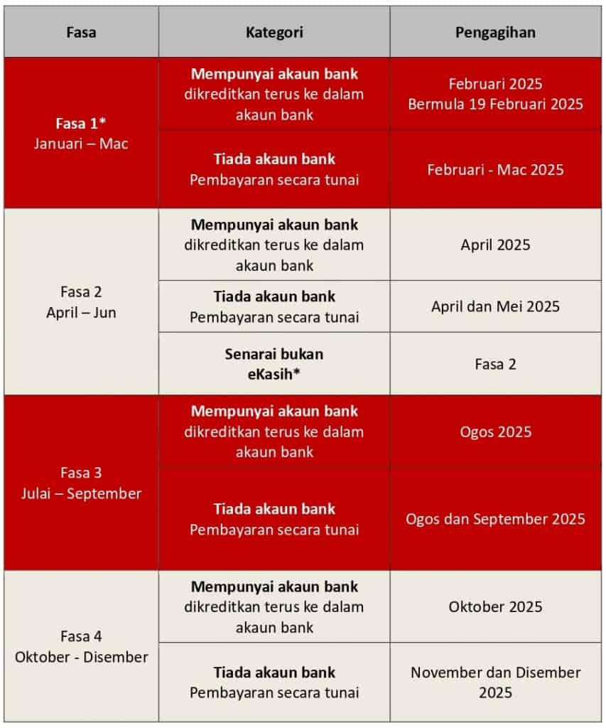 Nota: Tarikh pembayaran untuk Fasa 3 masih belum diumumkan secara rasmi, tetapi penerima boleh merujuk jadual ini untuk anggaran pembayaran.