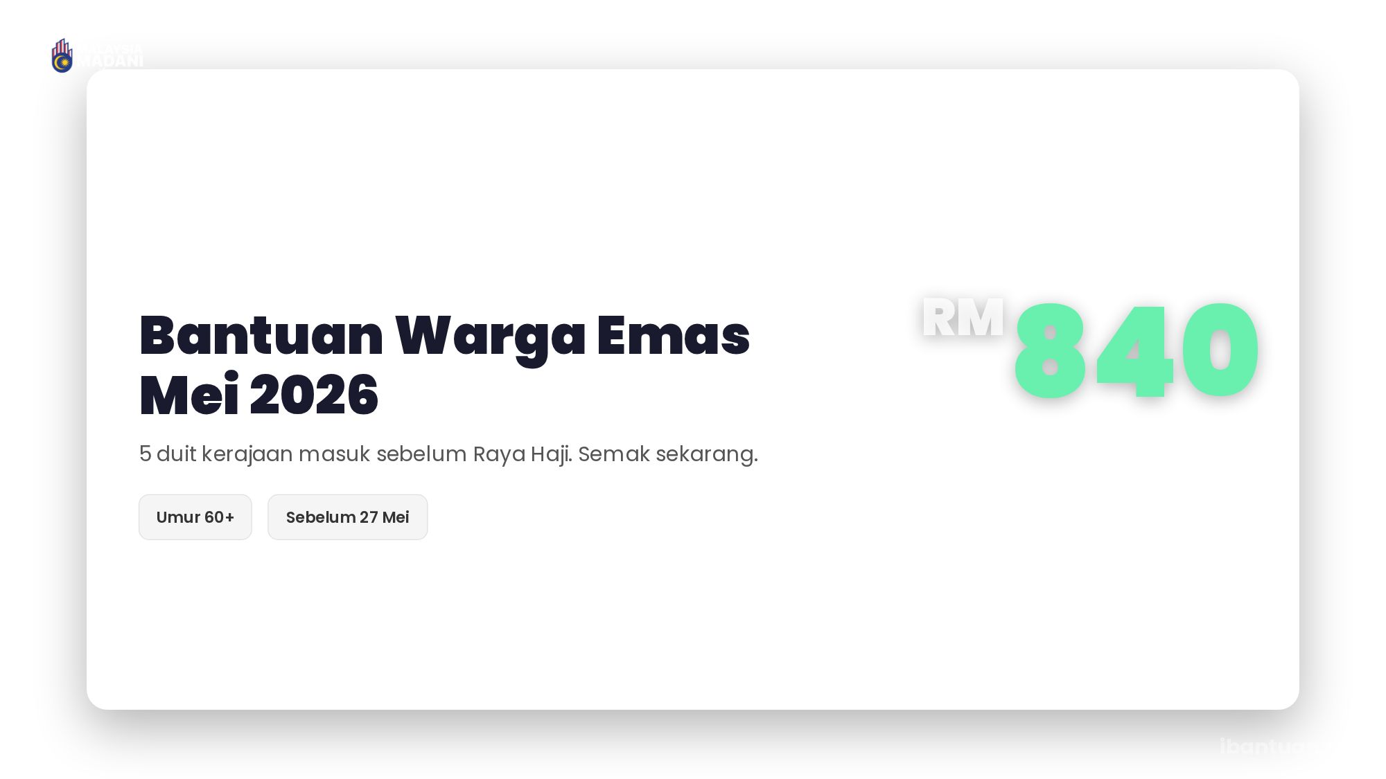 | Bantuan Orang Tua (BOT) | RM600 | Umur 60+, pendapatan rendah |