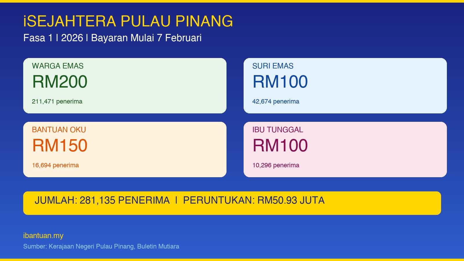 Kerajaan Negeri Pulau Pinang telah mula menyalurkan bayaran iSejahtera Fasa 1 2026 bermula 7 Februari 2026, membabitkan peruntukan RM50.93 juta kepada 281,135 penerima merangkumi warga emas, suri rumah, OKU dan ibu tunggal.