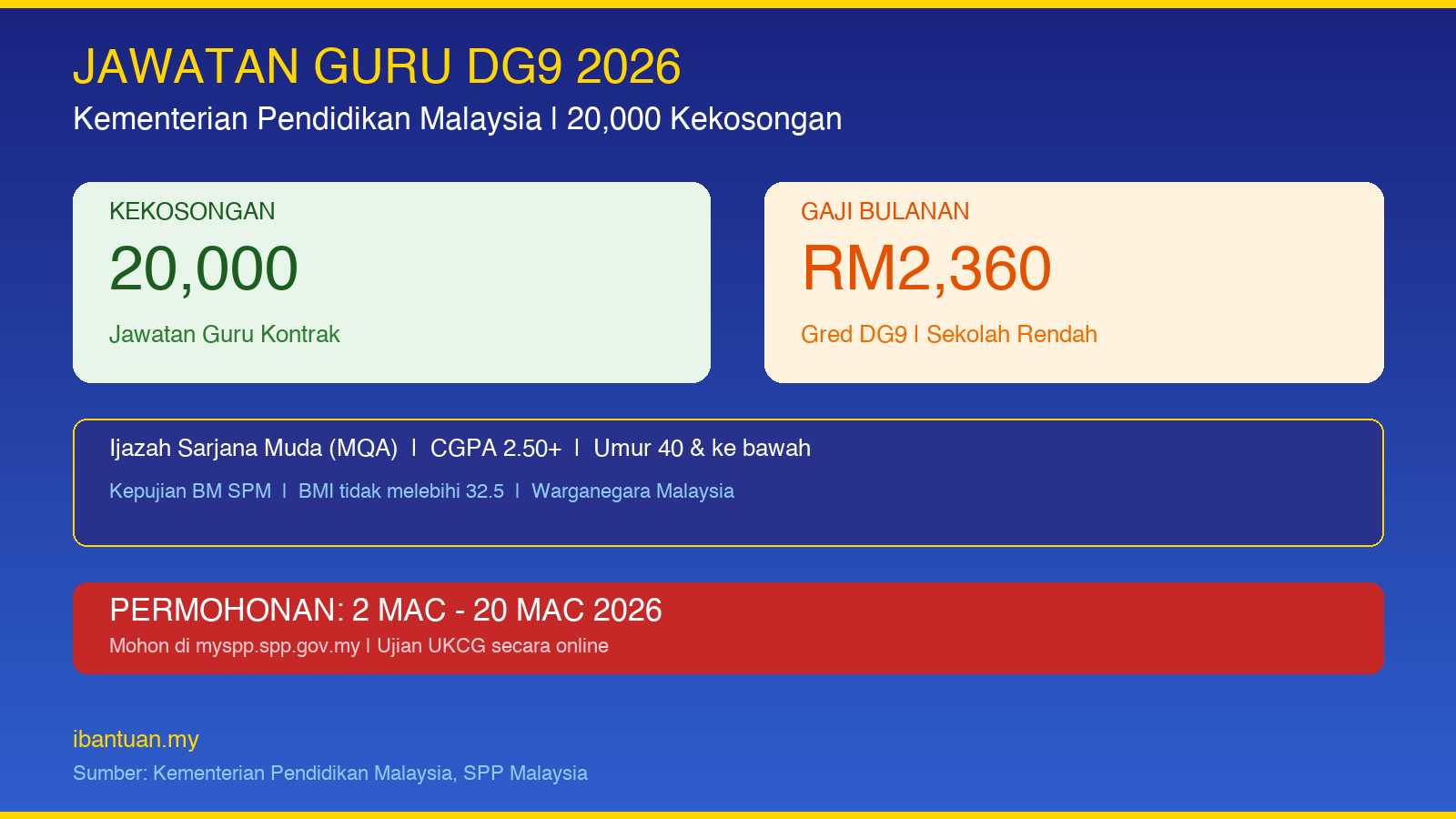 Kementerian Pendidikan Malaysia (KPM) mengumumkan pembukaan 20,000 jawatan guru baharu bagi jawatan Pegawai Perkhidmatan Pendidikan Gred DG9 secara kontrak (Contract of Service). Permohonan dibuka mulai 2 Mac 2026 hingga 20 Mac 2026 melalui portal rasmi SPP dengan gaji permulaan RM2,360 sebulan.