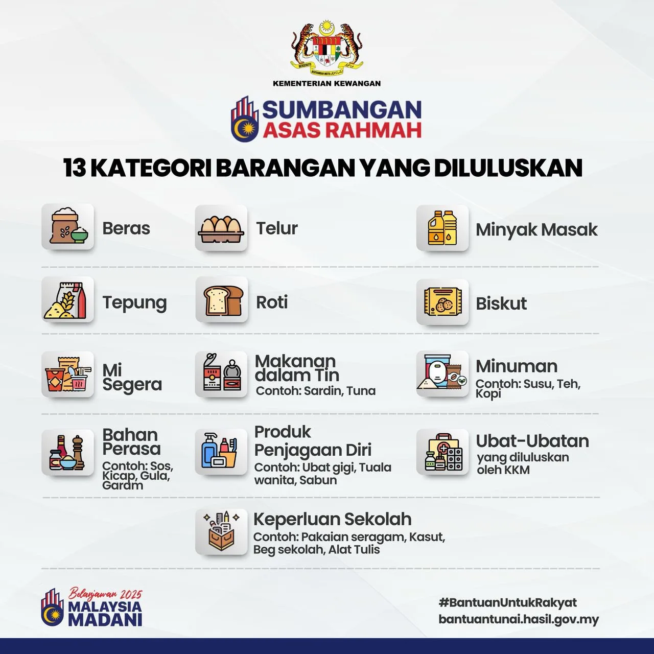 Berikut adalah senarai lengkap 14 kategori barangan yang boleh dibeli melalui program SARA 2025: