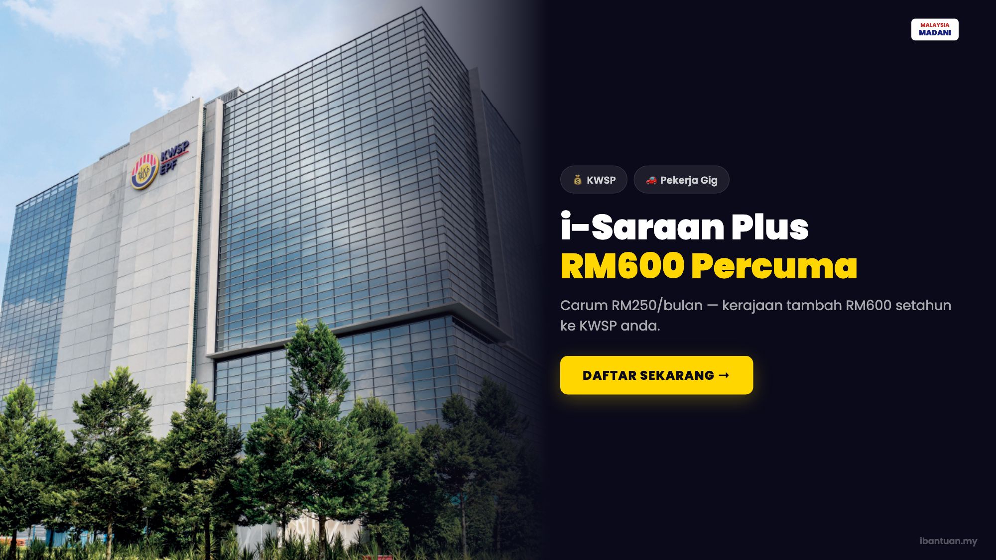 Dikemaskini pada 1 April 2026 — Jika anda pekerja sendiri, pemandu e-hailing, atau penghantar makanan, anda layak mendapat insentif percuma sehingga RM600 setahun daripada kerajaan melalui program KWSP i-Saraan Plus. Anda hanya perlu mencarum — kerajaan akan padankan 20% secara automatik.