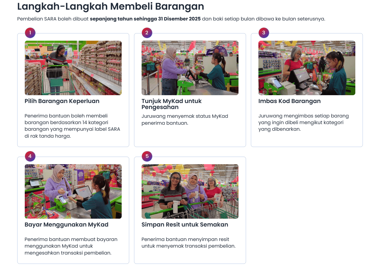 Dengan MyKasih, penerima Sumbangan Asas Rahmah (SARA) dapat membeli barangan asas tanpa menggunakan wang tunai, hanya dengan mengimbas MyKad. Pastikan alamat emel anda telah dikemaskini dalam aplikasi MyKasih sebelum 31 Disember 2025 untuk memastikan akses lancar kepada bantuan SARA. Untuk maklumat lanjut atau pertanyaan, layari portal rasmi MyKasih.