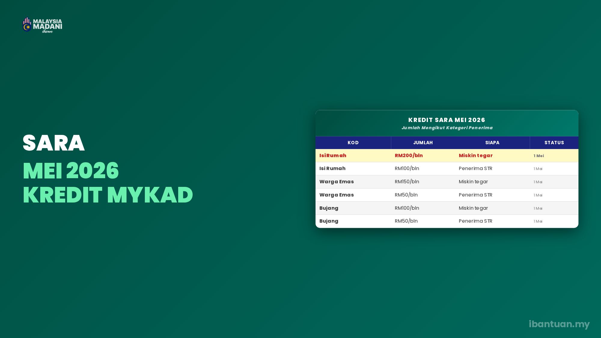 Kredit SARA dikreditkan pada 1hb setiap bulan. Untuk Mei 2026, kredit masuk pada 1 Mei 2026.