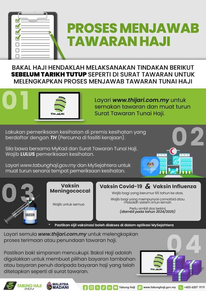 Sahkan penerimaan tawaran melalui THiJARI → jalani pemeriksaan kesihatan → lengkapkan bayaran → persiapan fizikal & mental.